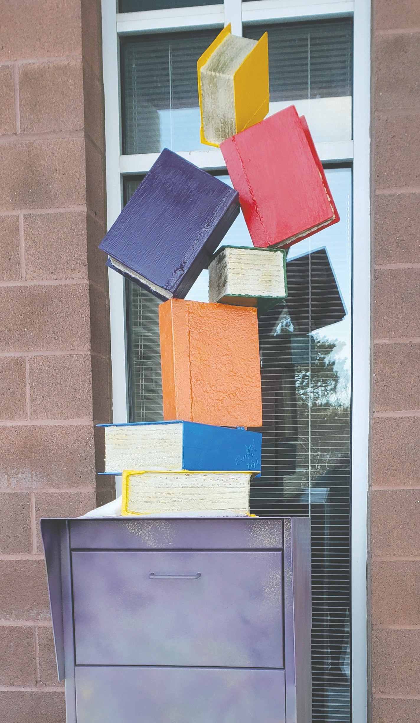 An artful tumble of books tops the book return at the Arrowhead Library System office in Mountain Iron. Photo by Cindy Kujala.