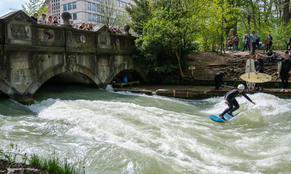 Munich’s Eisbach Wave is located in the English Gardens, within walking distance of two beer gardens.