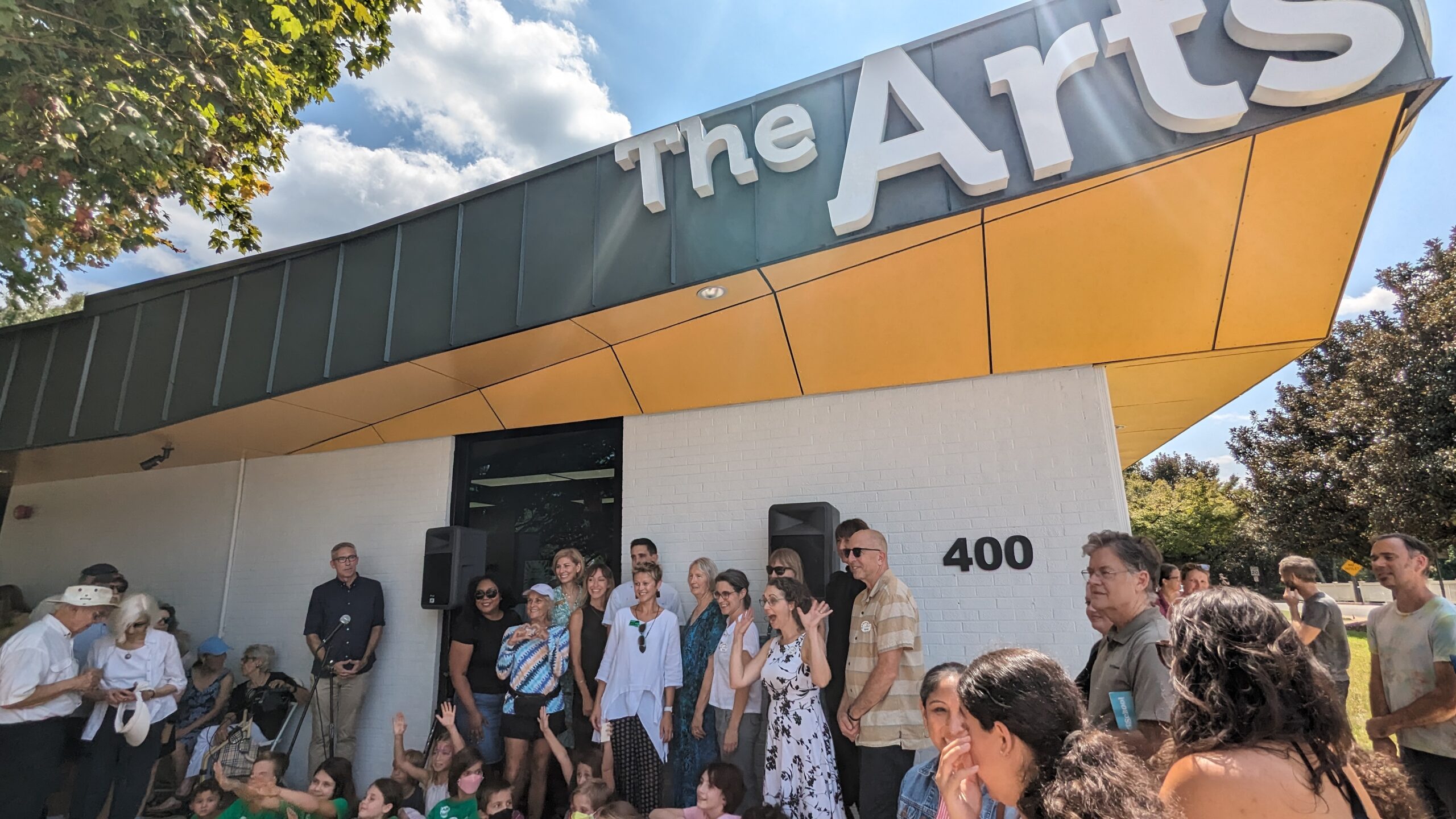 Festivities began at the prior ArtsCenter location: 300 East Main Street, where it’s lived for decades. Staff, community members, and the Paperhand Puppet Intervention performance group gathered outside to lead a parade just around the block to the new location. The giant puppets and drums caught many people’s attention, beckoning them to look toward the white building at the corner of Roberson Street with a yellow and silver roof that has the new The ArtsCenter logo emblazoned on it.
