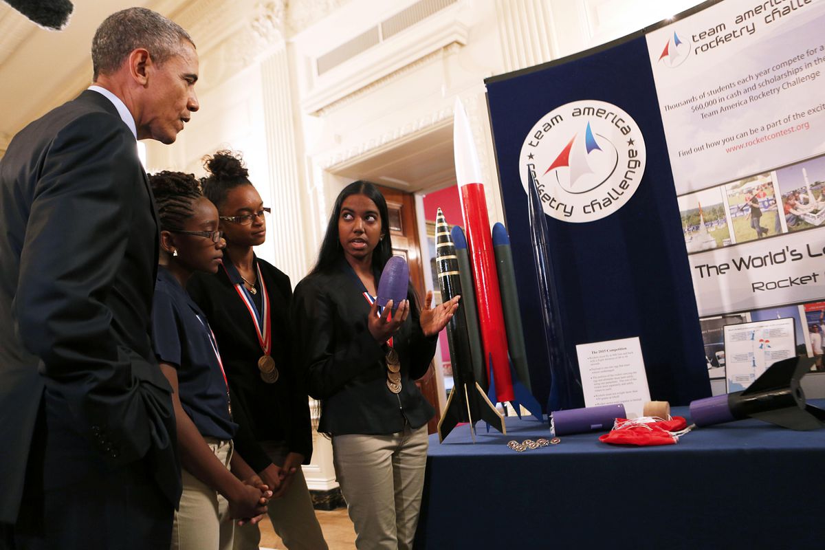 Us President Barack Obama listens to Stephanie Bullock (R) who is part of a team from the US Virgin … [+]