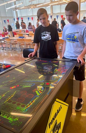 Alex (left) and Ethan Williams play an LED monitor pinball machine at the Wayne County Makers Faire at Wayne College in 2021.