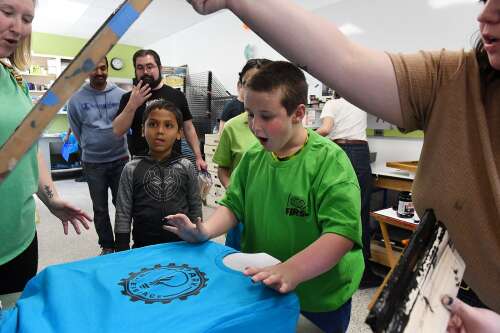Keagan Fogarty, 9, of Gales Ferry, after learning how to screen print a design onto a t-shirt Saturday, May 6, 2023, reacts as Natalie Grayson, right, lead in the print shop, raises the screen to reveal the design he printed on the t-shirt during Free Day at Spark Makerspace in New London. (Dana Jensen/The Day) Buy Photo Reprints