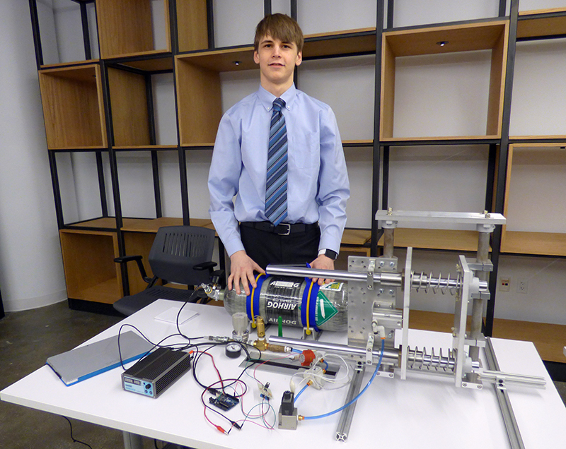 Computer engineering student Matt Cocca plugged a cable into a tabletop pneumatic piston.