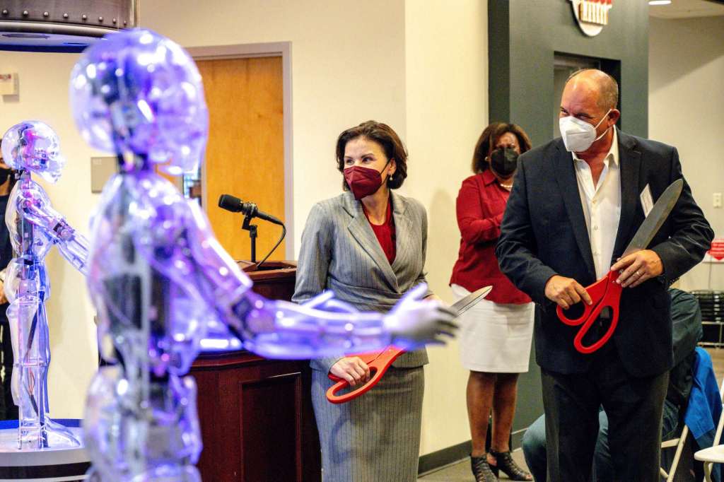 University of Redlands President Krista Newkirk holds a 3D printed model as guests tour inside the makerspace during the unveiling of the Fletcher Jones Foundation Innovation Center at University of Redlands in Redlands on Friday, Oct. 8, 2021. (Photo by Watchara Phomicinda, The Press-Enterprise/SCNG)