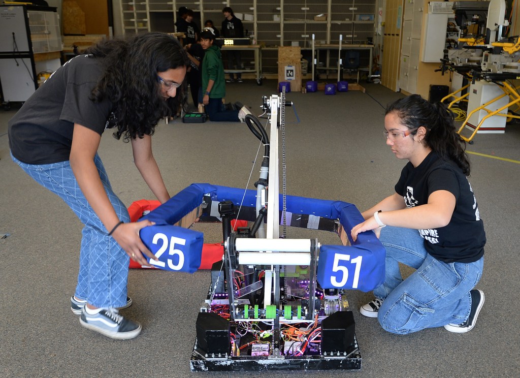 San Marin Robotics Club members Sahasra Kalluri, left, and Noela De Frenza put a bumper on their robot Cold Feet at San Marin High School in Novato on Tuesday, April 4, 2023. The club also known as Teen Penguin Empire has won a berth at a World robotic competition in Houston later this month. (Sherry LaVars/Marin Independent Journal)