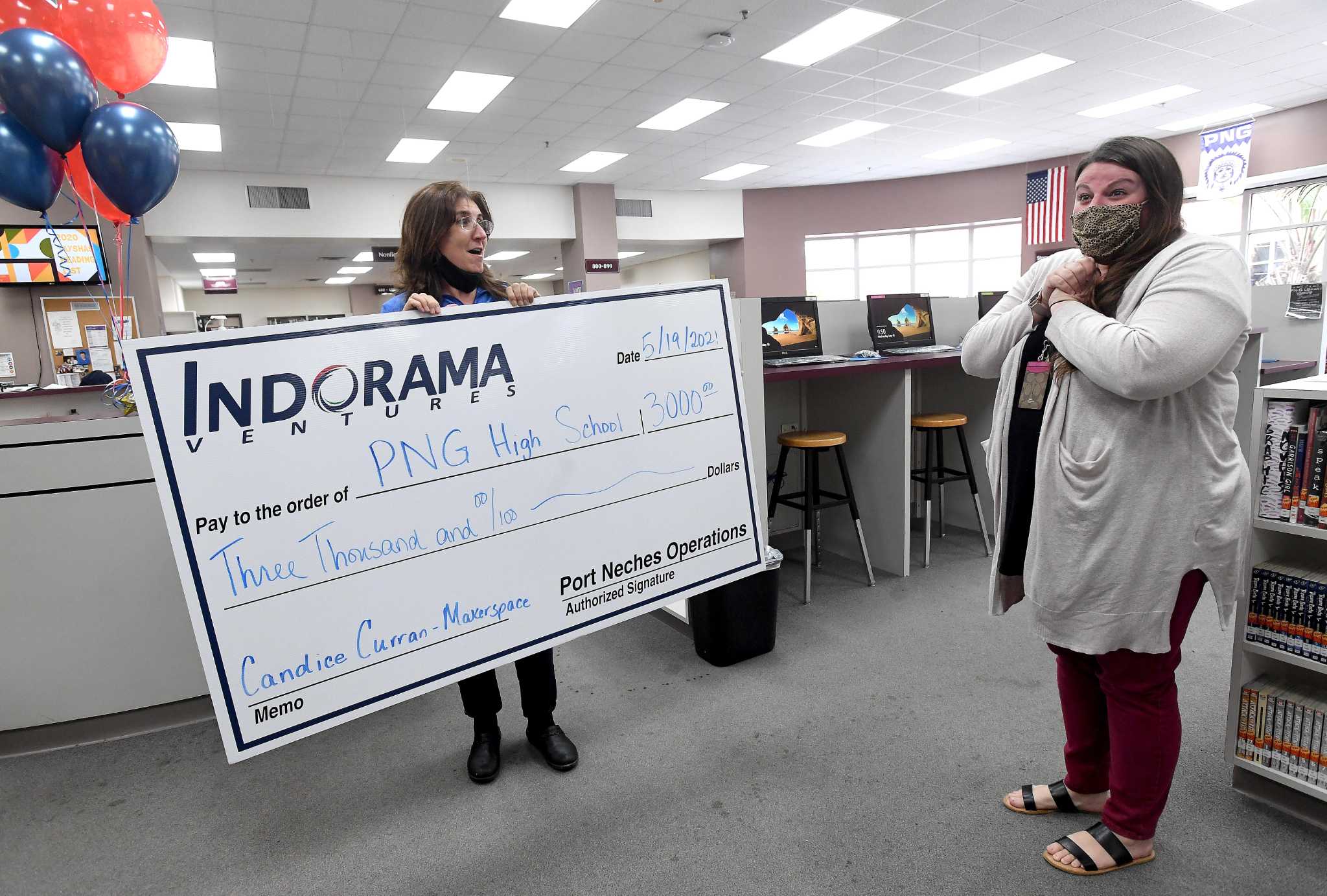 As if the check for $3,000 wasn’t enough, Port Neches-Groves High School Librarian Candice Curran laughed, saying, “I get a present too?” as Indorama Ventures Port Neches Site Director Kim Hoyt presented her with a gift bag during a surprise presentation last week.