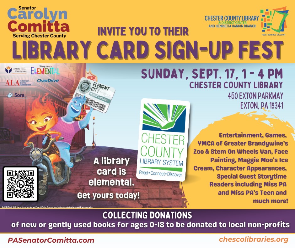 “The Chester County Library & District Center is really excited to partner with Senator Comitta for our first-ever Library Card Sign-Up Fest this September! There is so much to discover at the library,” said Chester County Library Director, Mary Gazdik. “I hope families will join us on September 17th from 1-4 pm at Chester County Library in Exton for a fun day where you can get a taste of some delicious ice cream from Maggie Moos and check out all the fun activities we have planned for the day including crafts, face painting, story times with special guest readers…