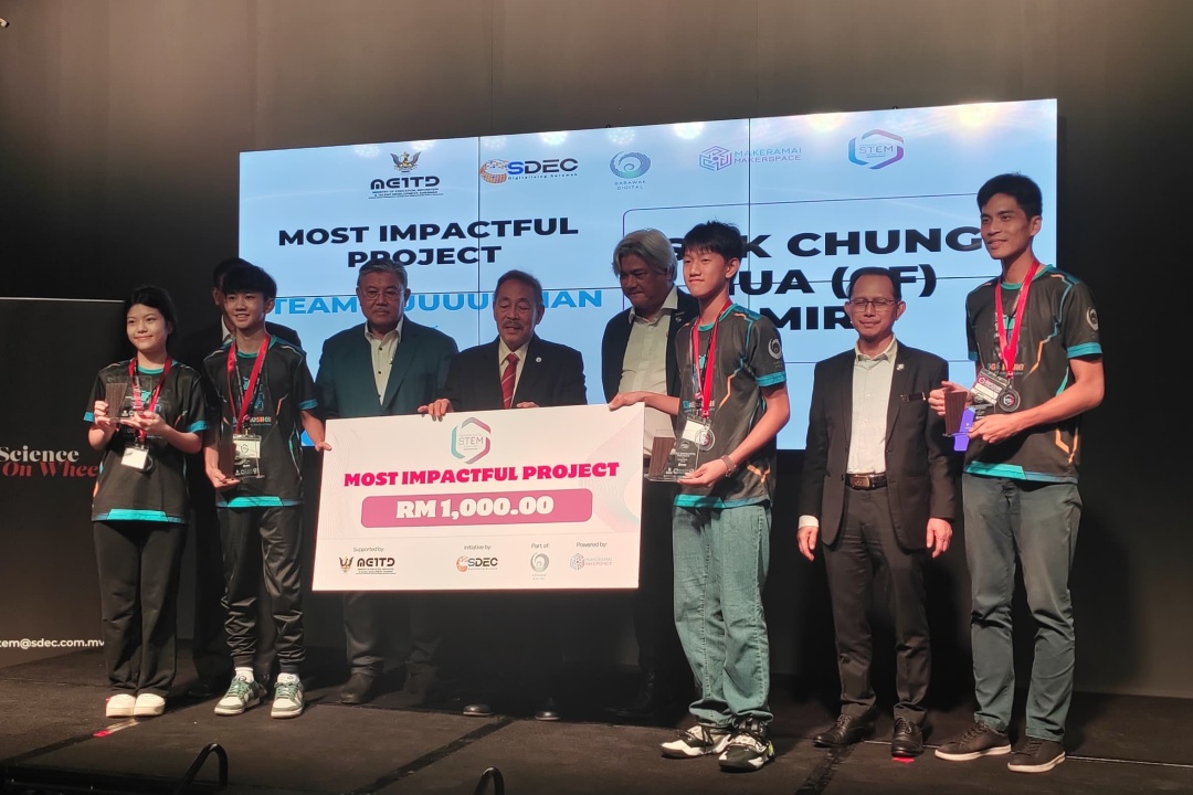 Sagah (fourth left) presents an award to the winner of the ‘Most Impactful Project’ category in conjunction with the Sarawak Digital STEM Demo Day 2025.