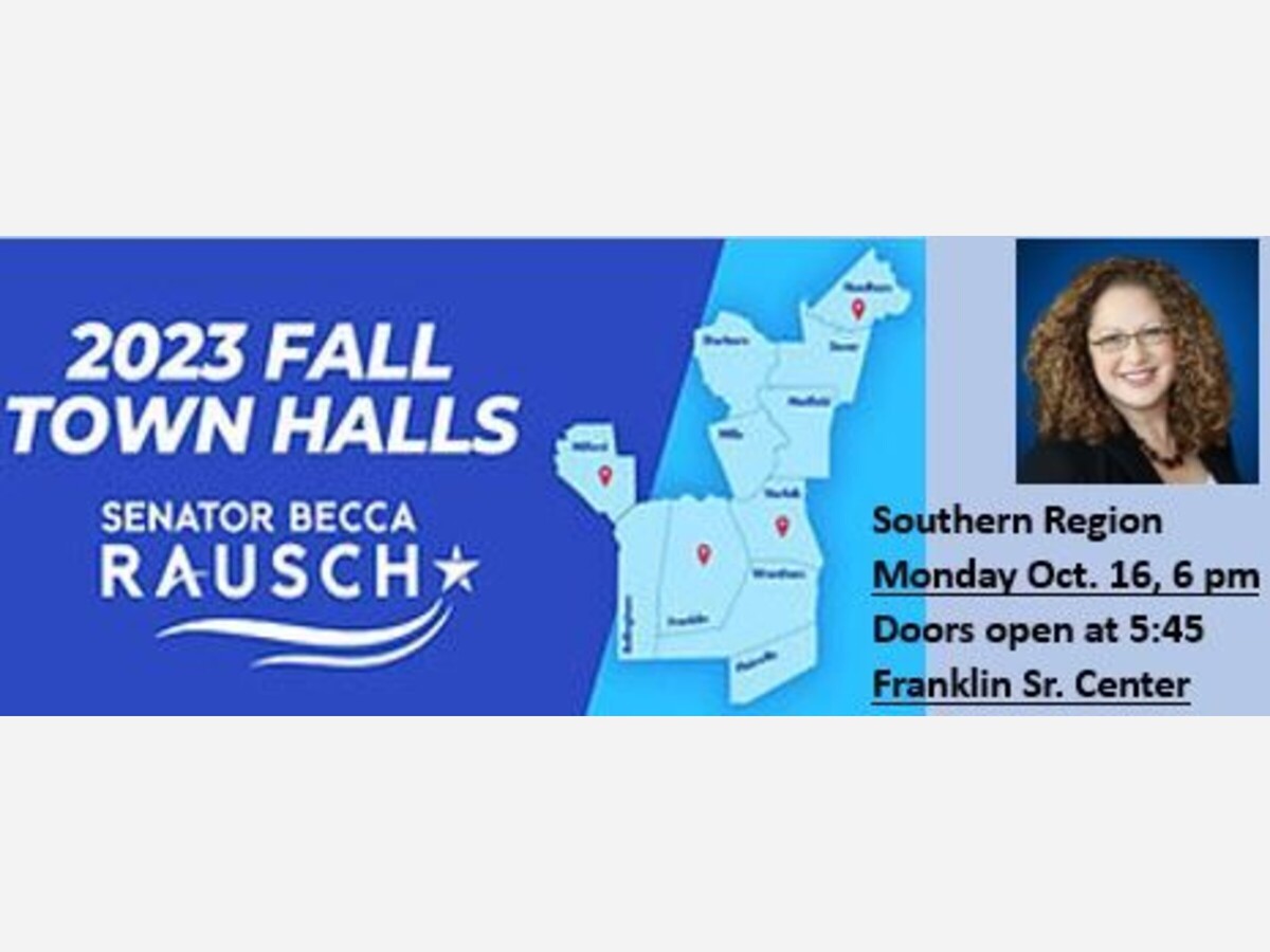 “My team and l are excited to host regional in-district Town Halls this Fall. During these events, I will provide legislative and other updates from Beacon Hill and chat about constituents’ questions, comments, and ideas. Residents from any part of the district are invited to attend whichever Town Hall is most convenient for them. We’ll be joined by our partners in the House of Representatives and local government. Hope to see you there!” — Senator Becca Rausch