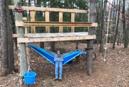 “The tree house is 6 or 7 feet off the ground and has a roof, a front…