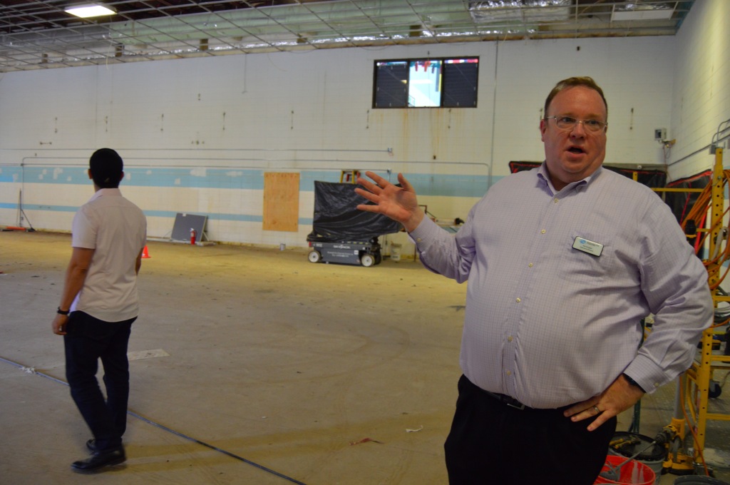 Boys & Girls Club of Greater Lowell Joe Hungler shows the progress being made by June 29, 2023 in what was once the club’s pool that will be turned into a large multipurpose space and cafeteria. (Peter Currier/Lowell Sun)