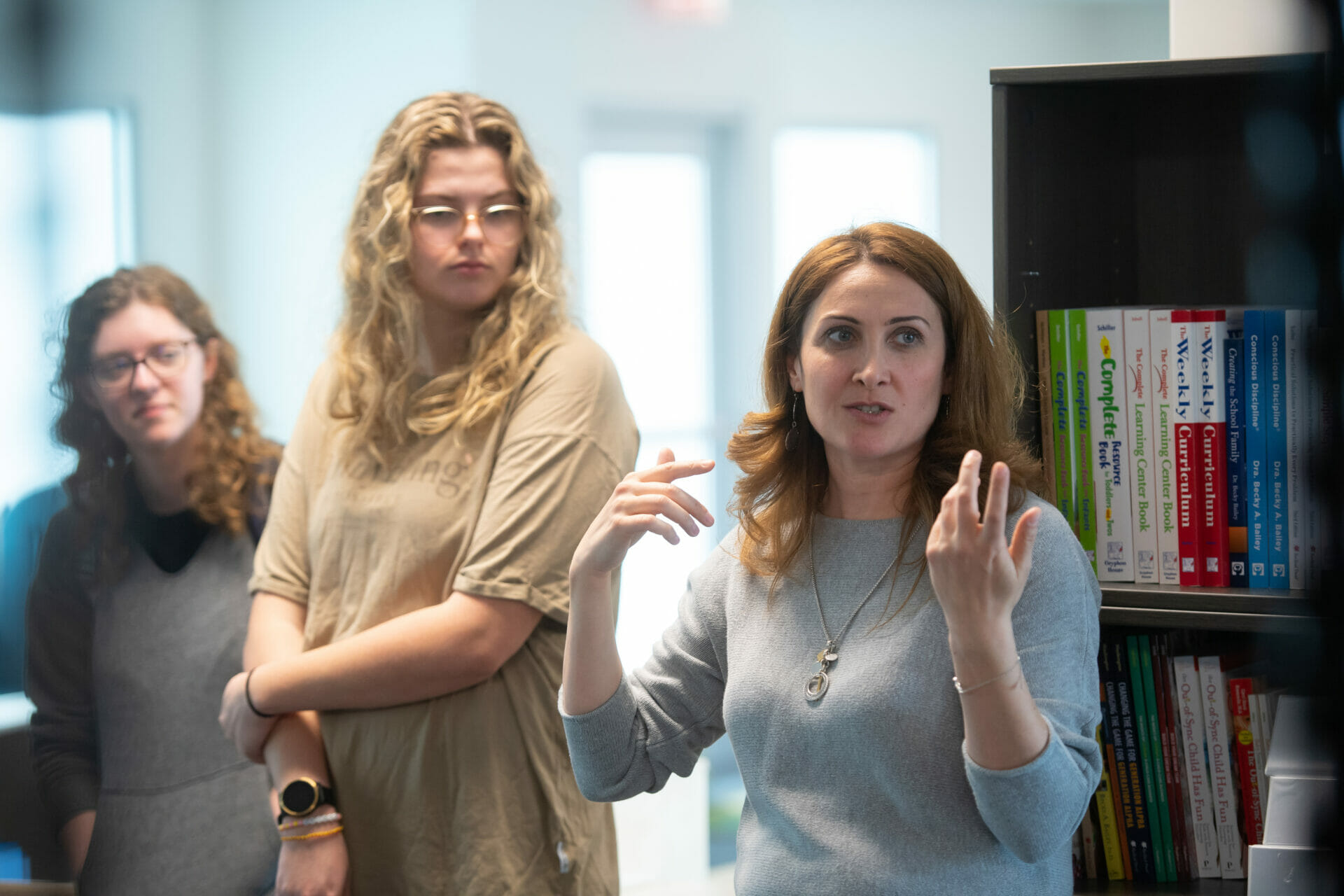 Shushan Vardanyan (right), assistant professor of early childhood education at the University of Mississippi, stands before books available for checkout in the North Mississippi Child Care Resource and Referral Center. The center has tools, tactile learning toys and learning materials available for checkout for up to four weeks and serves as a training and support center for educators and guardians. Photo by Kevin Bain/Ole Miss Digital Imaging Services