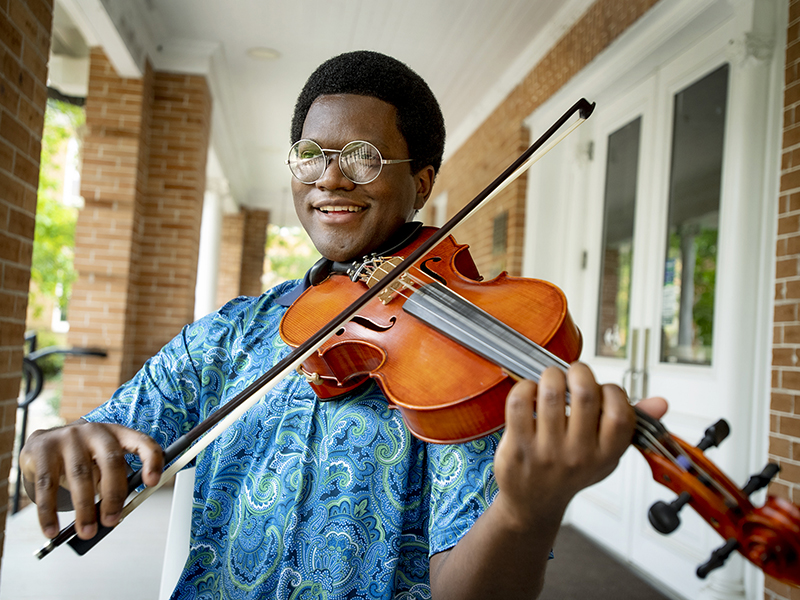 Robert Johnson, who is receiving a Bachelor of Science from the School of Science and Engineering, with a double major in engineering physics and mathematics and a minor in music, is part of POSSE, a Maker Ninja at the Scot Ackerman Makerspace, and was part of the Tulane University Marching Band his first and second year at Tulane. Johnson will pursue his PhD at the University of Rochester’s Institute of Optics. (Photo by Paula Burch-Celentano)