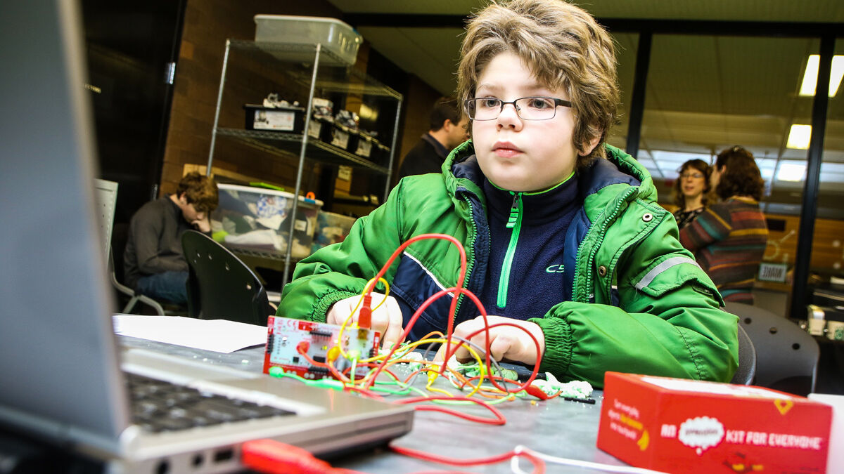 THINKING OUTSIDE THE BOX. The Dabble Box is a new makerspace at the L.E. Phillips Memorial Public Library in Eau Claire. During a recent open house, 10-year-old Ryan Grzyb (top) played a video game with do-it-yourself Play-Doh controllers. The same system can be used to play a virtual piano with bananas (below).