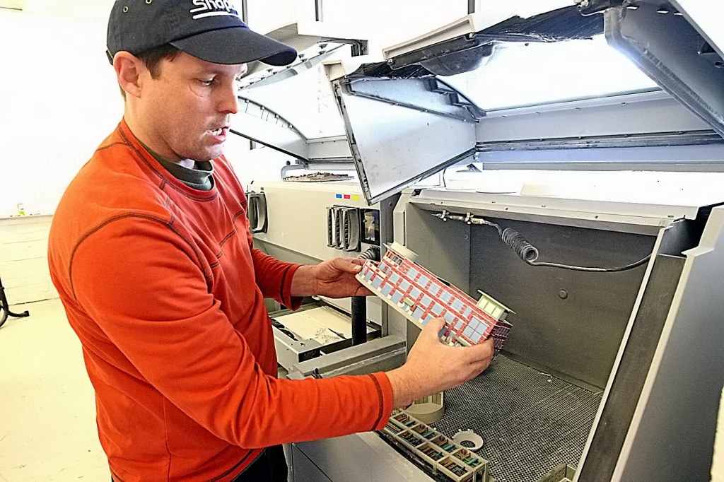 Cabrillo College Makerspace Director Payson McNett handles a gypsum printed architectural model produced by one of the Makerspace 3-D printers at Cabrillo College. (Dan Coyro — Santa Cruz Sentinel)