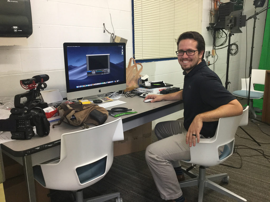 New Richmond High School integration specialist Dakota Smith demonstrates the audio/visual equipment in the school’s new makerspace. Photo provided.