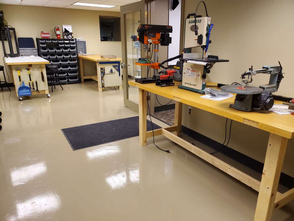 The facility houses multiple 3D printers (FDM and resin), a CNC laser router, drill press, scroll saw, band saw, belt and disk sander, soldering irons, a variety of hand and power tools and more.