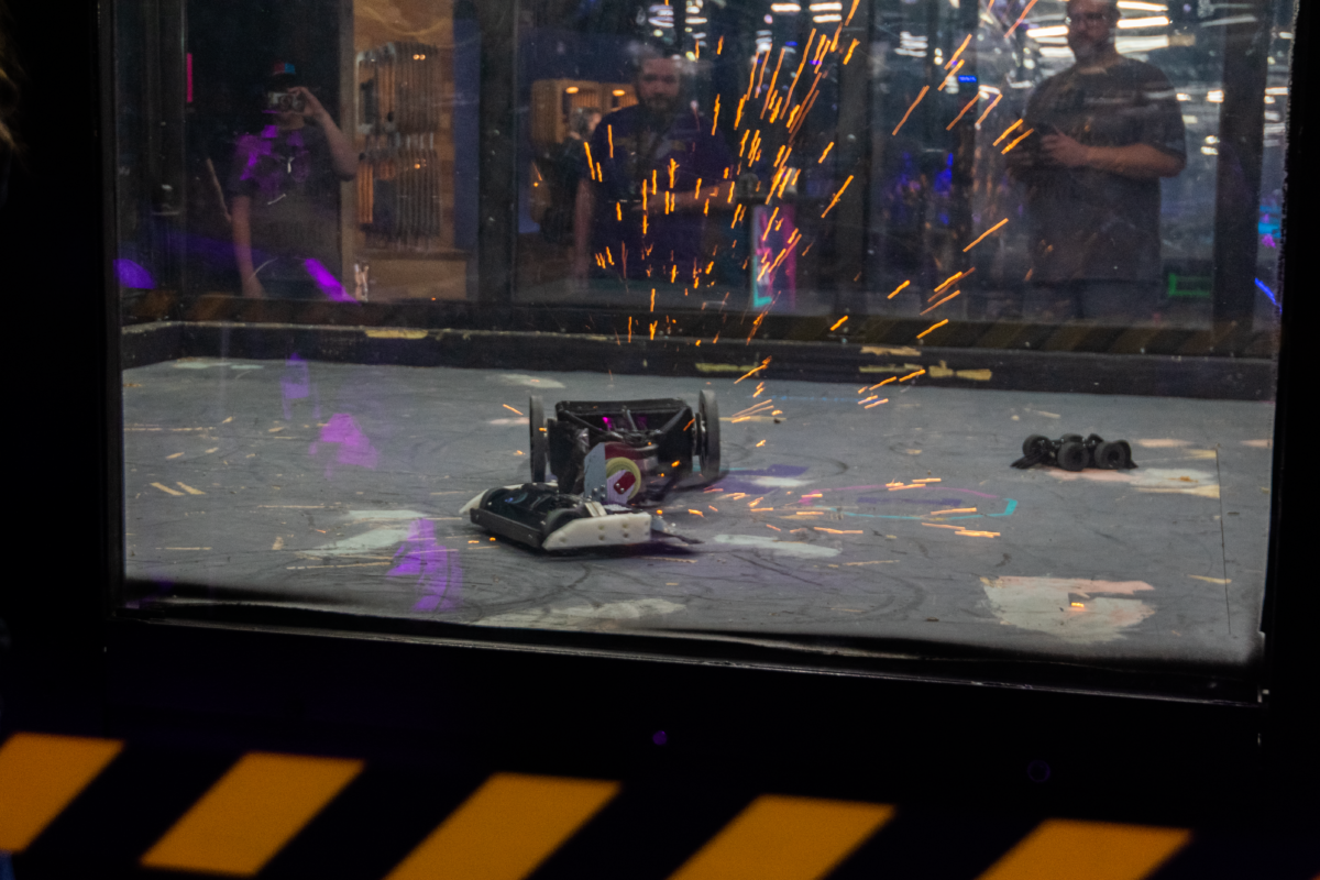 Hundreds of people attended the competitions in person and thousands more around the world tuned into the livestreams. At the end of the all-day competition, the teams behind 30-pound wedge and vertical spinner equipped Emulsifier, UGEE the big wheeled 12-pound batterer and three-pound titanium-cleated Lynx each took home a “Golden Dumpster,” a brass plated miniature version of the NHRL’s boxy robotic referee “Brett.”